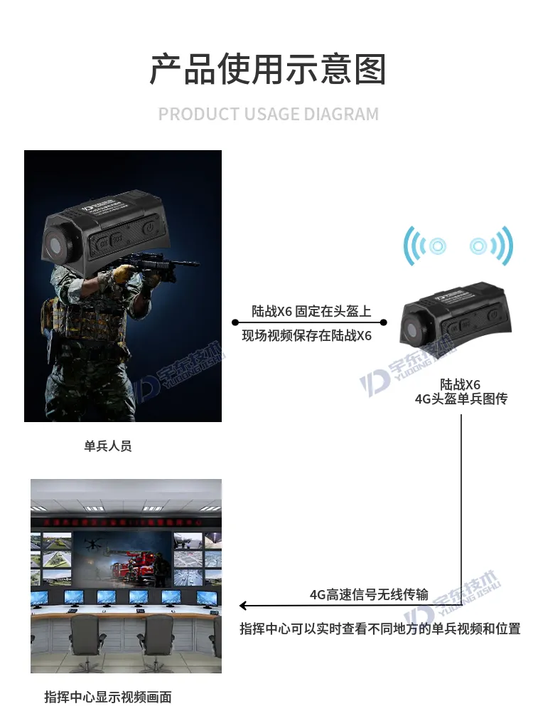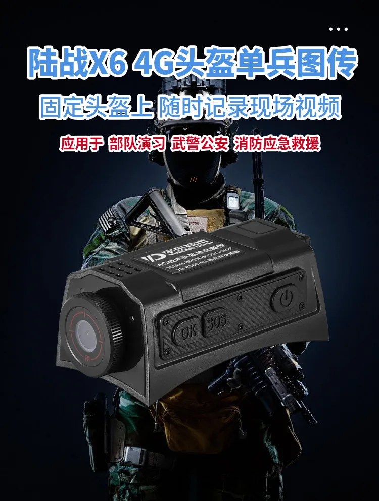 陸戰X6 4G戰術頭盔單兵無線圖傳是針對武警,特警,移動執法取證、行政監管等單人便攜式監控需求應用場景開發的專用設備,該產品采用高速處理器和嵌入式Linux操作系統,集超低照度彩色攝像機、音頻、4G和Wi-Fi無線通訊模塊、北斗、存儲、報警等模塊,配置高清夜視攝像頭及無線藍牙耳機。設備可通過4G、Wi-Fi無線網絡進行實時視音頻信息傳輸、語音對講等功能;協同后端功能完善的監控調度指揮平臺系統實現針對戶外移動式個體的遠程調度指揮功能。