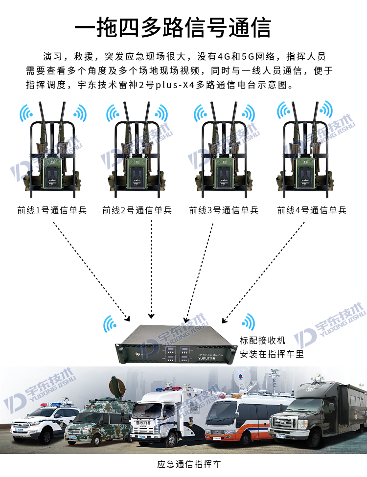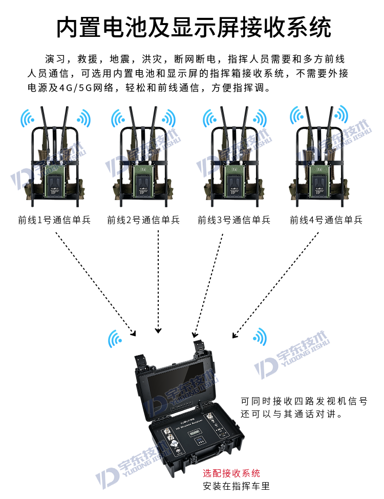 宇東技術(shù)雷神2號plus-X4一拖四背負式高清無線圖傳電臺,是應(yīng)對突發(fā)事故,斷網(wǎng)斷電,如地震、洪災(zāi)、反恐、應(yīng)急救援、部隊演習(xí)等使用通信,本設(shè)備由4路背負式單兵發(fā)射機電臺和1臺四路接收于一體的接收電臺地面指揮箱組成,指揮箱自帶四路接收模組和顯示器及功能按鍵,可同時接收四路發(fā)射機的視頻和對講信號數(shù)據(jù),指揮箱自帶揚聲器,可接收DV無線發(fā)送現(xiàn)場的聲音數(shù)據(jù)。支持擴展HDMI外接顯示大屏及插USB錄像保存功能,真正義意上做到及時取證,錄像保存,移動通信,統(tǒng)計指揮調(diào)度等。