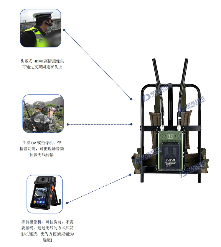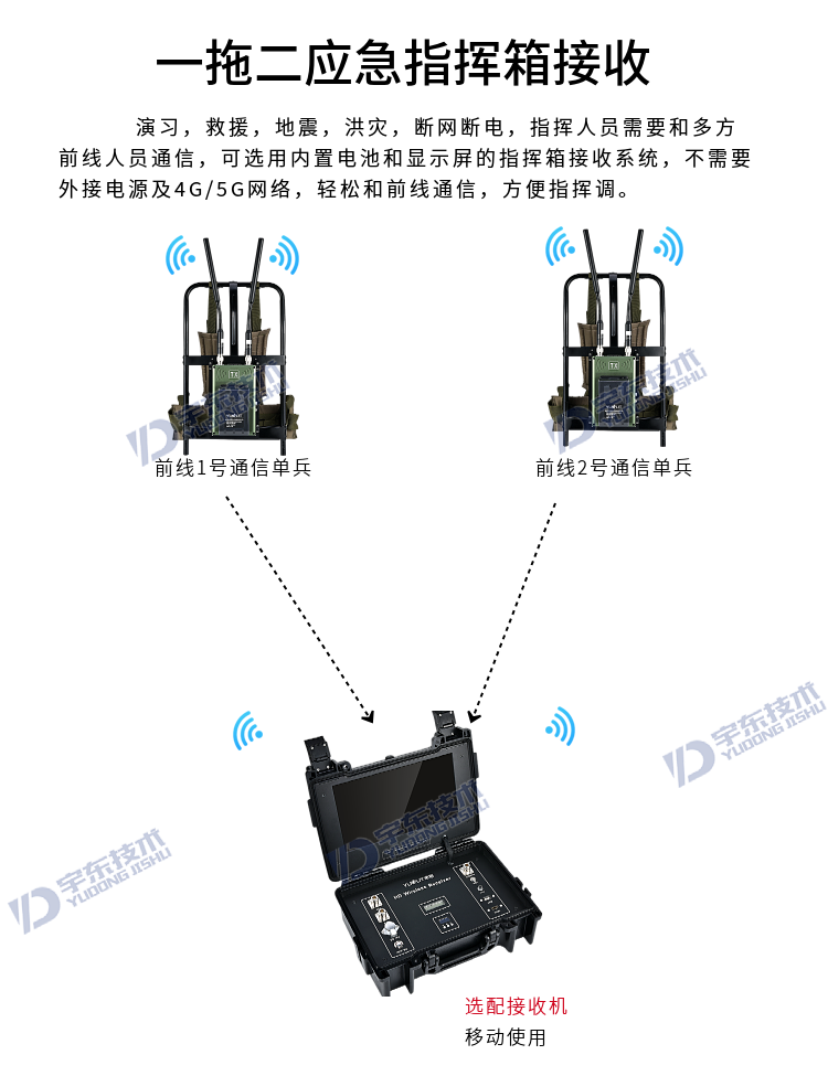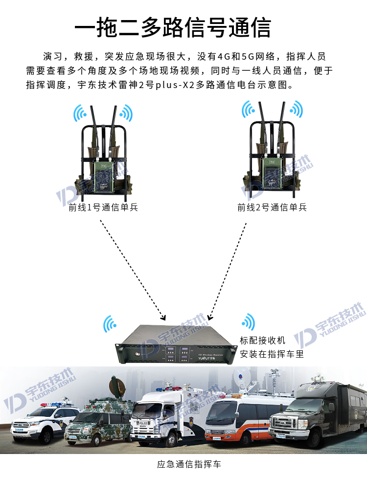 宇東技術雷神2號plus-X2一拖四背負式高清無線圖傳電臺,是應對突發事故,斷網斷電,如地震、洪災、反恐、應急救援、部隊演習等使用通信,本設備由4路背負式單兵發射機電臺和1臺四路接收于一體的接收電臺地面指揮箱組成,指揮箱自帶四路接收模組和顯示器及功能按鍵,可同時接收四路發射機的視頻和對講信號數據,指揮箱自帶揚聲器,可接收DV無線發送現場的聲音數據。支持擴展HDMI外接顯示大屏及插USB錄像保存功能,真正義意上做到及時取證,錄像保存,移動通信,統計指揮調度等。