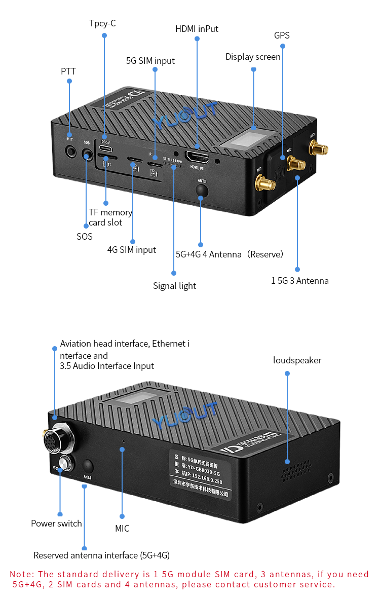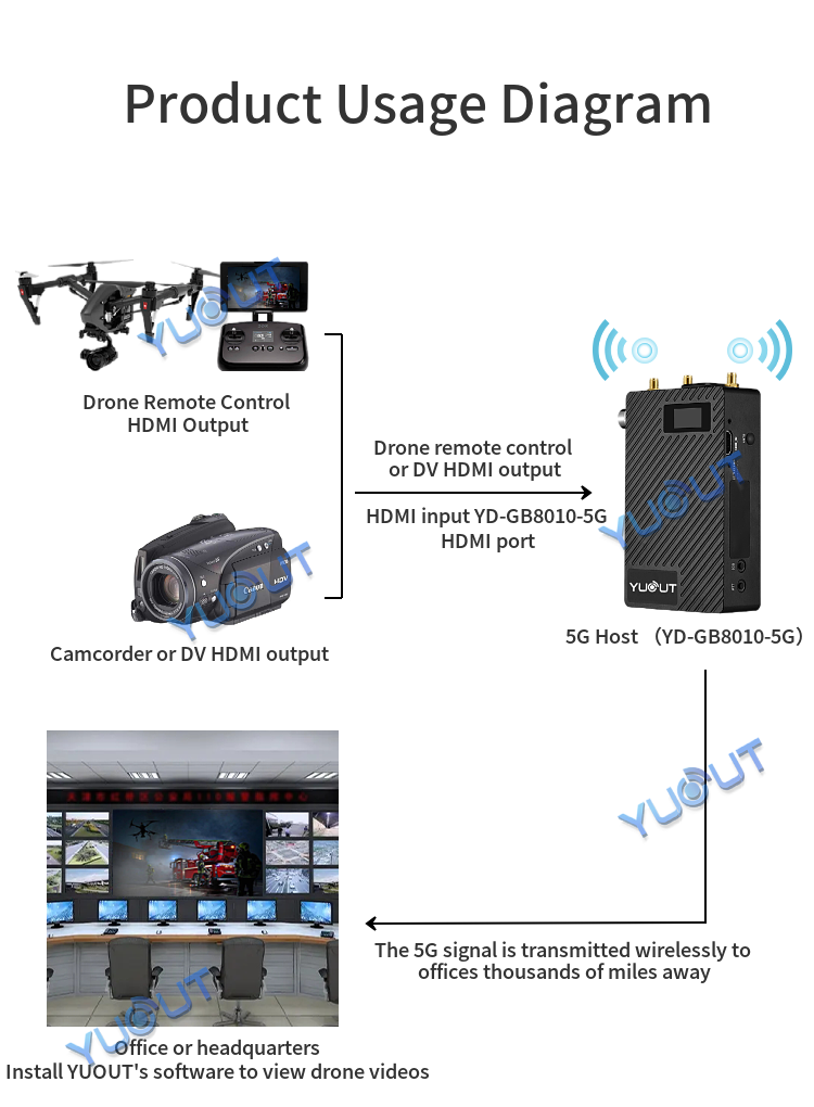 YD-GB8010-5G is a device developed by YUOUT Company for emergency rescue command, fire rescue, forest fire fighting, etc. The main function is to transmit the HDMI signal output by the drone remote control or the HDMI signal output by DV/ camera from the outdoor to the office or command center through 5G. By installing YUOUT's platform software in the office, you can view video from drones or cameras remotely. The product adopts an integrated design, integrating video hardware coding, 5G/4G network, GPS positioning, two-way intercom call, data storage, lithium battery and other modules. It can be used in combination with UAV, DV camera and other camera equipment through HDMI input interface. It has the characteristics of light and compact, flexible and convenient use, comprehensive function and high reliability.