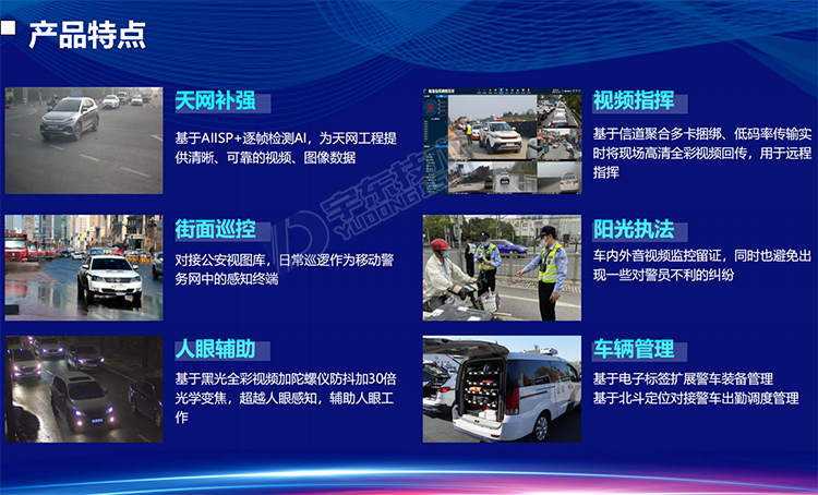 5G雷神V8 360全景視頻警燈系統(tǒng)是針對(duì)警用執(zhí)法、刑偵和應(yīng)急指揮開發(fā)的智能警用裝備。產(chǎn)品可部署在車輛等移動(dòng)載體上,能夠?qū)囕v周邊人員特征、車輛特征的關(guān)鍵信息進(jìn)行采集。通過(guò)智能比對(duì)技術(shù),對(duì)人員、車輛信息進(jìn)行分析、甄別,實(shí)現(xiàn)對(duì)重點(diǎn)監(jiān)管目標(biāo)的提前預(yù)警,同時(shí)還可以通過(guò)5G/4G等網(wǎng)絡(luò)接入公安應(yīng)急指揮調(diào)度平臺(tái),實(shí)現(xiàn)前端警力的調(diào)度、指揮以及對(duì)突發(fā)事件的應(yīng)急處置。產(chǎn)品可應(yīng)用于警用大數(shù)據(jù)采集、黑名單布控、人員違法抓拍、武裝押運(yùn)監(jiān)管等場(chǎng)景。