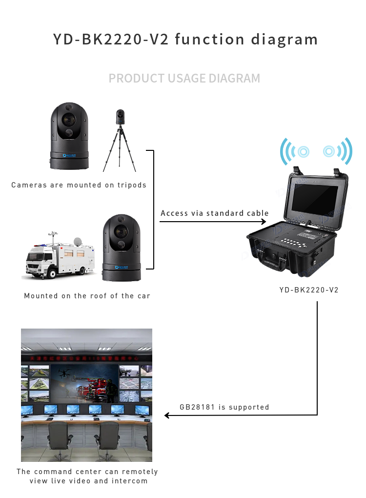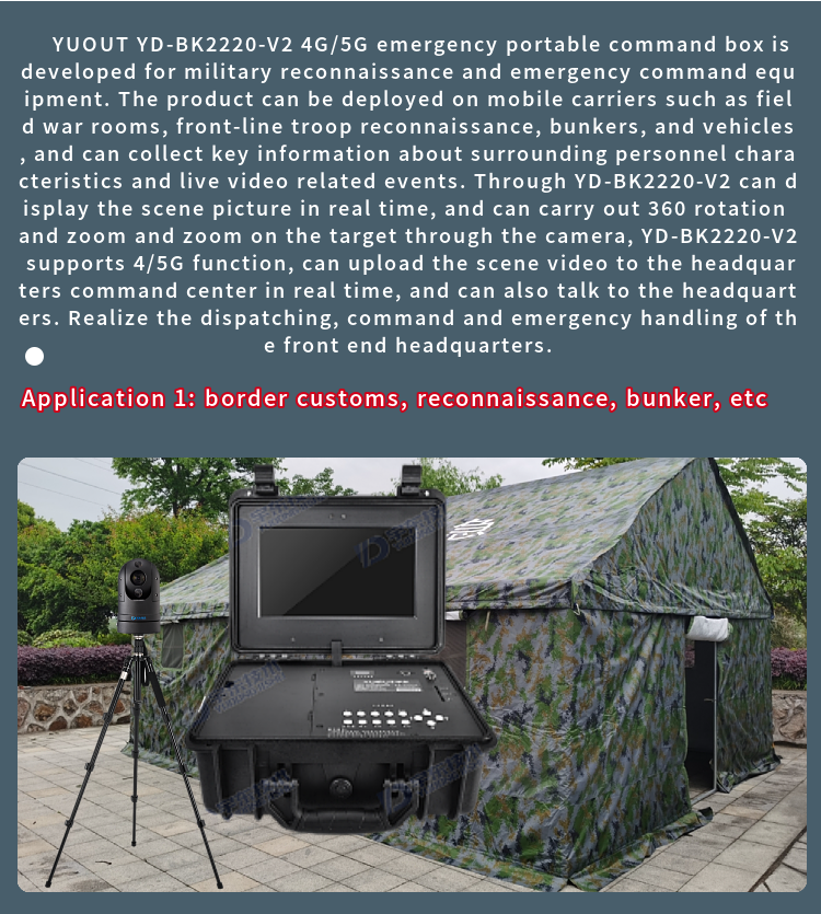 YUOUT YD-BK2220-V2 4G/5G emergency portable command box is developed for military reconnaissance and emergency command equipment. The product can be deployed on mobile carriers such as field war rooms, front-line troop reconnaissance, bunkers, and vehicles, and can collect key information about surrounding personnel characteristics and live video related events. Through YD-BK2220-V2 can display the scene picture in real time, and can carry out 360 rotation and zoom and zoom on the target through the camera, YD-BK2220-V2 supports 4/5G function, can upload the scene video to the headquarters command center in real time, and can also talk to the headquarters. Realize the dispatching, command and emergency handling of the front end headquarters.